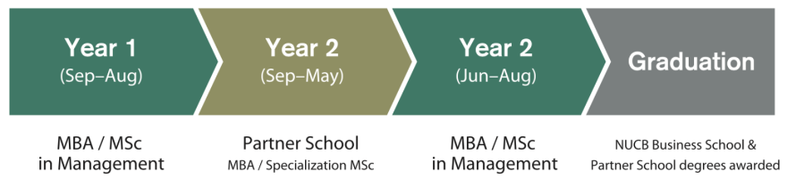 4月入学の場合は、1年次後期(9月)から2年次5月末まで留学し、帰国後、2年次3月に修了するスケジュールとなります。