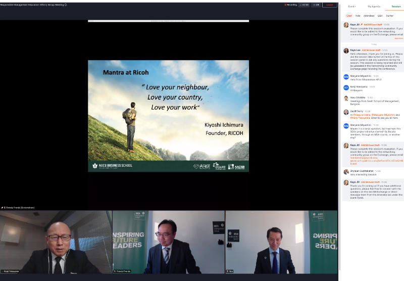AACSB (Association to Advance Collegiate Schools of Business) Asia Pacific chapter conference 2021 was held virtually on Thursday, November 17th. NUCB Business School faculty members Dr. Yokoyama (Dean of External Affairs), Dr. Goi, and Dr. Frendy participated in the conference and presented their research on Sustainable Development Goals (SDGs) with the theme “A Practical Case of SDGs Education: Achievement and Challenges.”