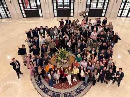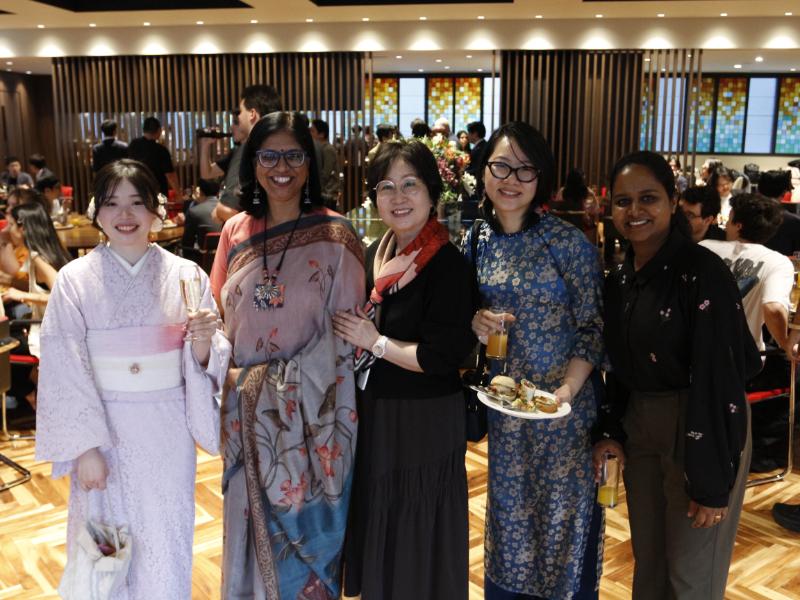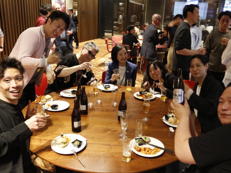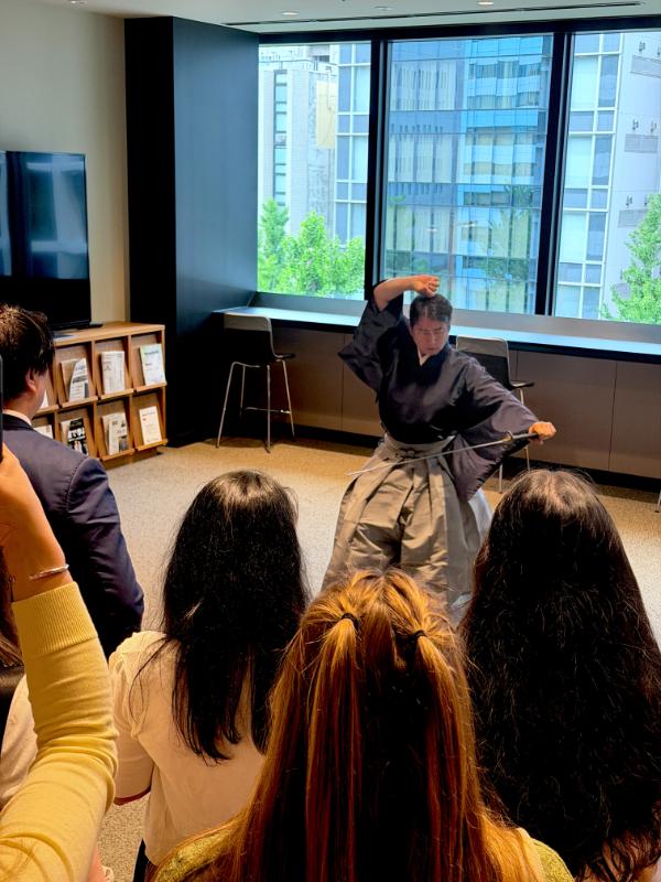 The event opened, as is tradition, with a captivating kenbu (剣舞) performance by EMBA alumnus Seishow Ando (Class of 2018), CEO of Denshow Platform, who continues to promote and preserve traditional Japanese performing arts. His performance set an elegant tone for the evening and reminded everyone of the deep cultural foundations that accompany our global learning environment. Glasses began to clink across the 3rd floor Learning Salon as the dinner service commenced, featuring a spring-inspired buffet and an atmosphere that quickly shifted from formal introductions to lively conversation and connection across programs and nationalities.