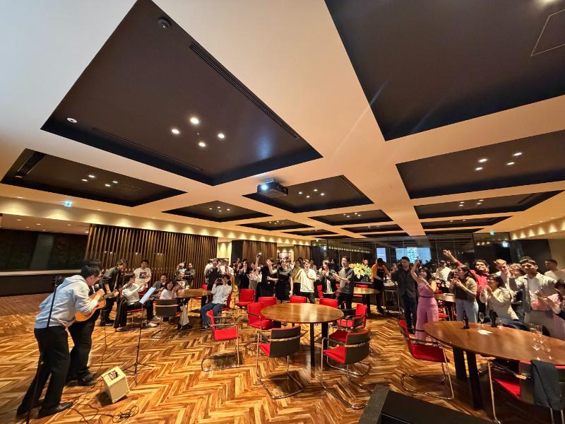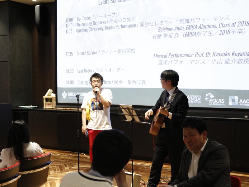 Later in the evening, Prof. Ryusuke Koyama took the stage with his guitar and amplifier, joined by EMBA student Osami Sano, to perform a few numbers, adding an unexpected and warmly received highlight to the night. As the evening progressed, the spirit of the party continued to build, culminating in Prof. Hiroshi Uchikoga leading a joyful, karaoke-style singalong of “Yellow Submarine,” bringing students, faculty, and alumni together in a shared moment of music and celebration.