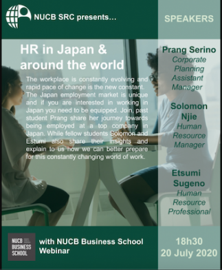 The last of these sessions will be held on July 20th at 6:30PM JST and is entitled "HR in Japan and Around the World." The session speakers will be NUCB BS alumnus Ms. Prang Serino, Corporate Planning Assistant Manager with Toyota Financial, and NUCB BS students Mr. Solomon Njie and Ms. Etsumi Sugeno.