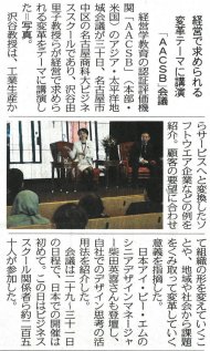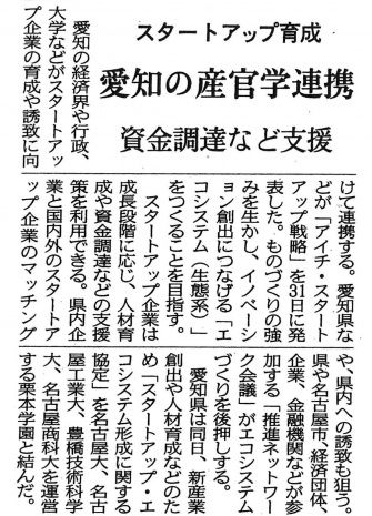 日本経済新聞(2018年11月1日)掲載されました 2018/11/02 Fri 日本経済新聞(2018/11/1) 日本経済新聞に、名古屋商科大学ビジネススクール関連の記事が掲載されました。 「スタートアップ育成 愛知の産官学連携 資金調達など支援」 愛知の経済界や行政、大学などがスタートアップ企業の育成や誘致に向けて連携する「アイチ・スタートアップ戦略」が発表されました。