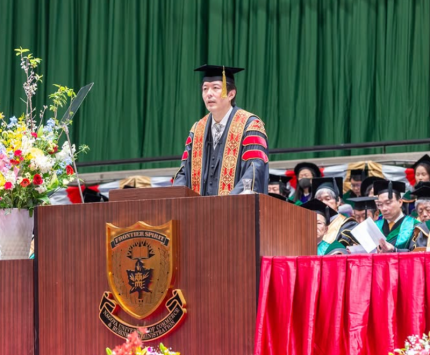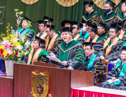 令和7年度入学式の特別来賓として、経営教育の国際認証機関AMBA & BGAの代表、アンドリュー・メイン・ウィルソン氏をお招きしました。過去60年間で最も不確実な時代を迎えている今こそ、「可能な限り最高の教育を受けること」が重要であると力強く語られ、新たな一歩を踏み出す新入生へ激励の言葉を贈られました。また、人生を豊かにし、真の成長を遂げるための指針として、「アカデミックな教育」「実務経験からの学び」「国際的な経験」「インスピレーションを受けること」の「生涯学習の4つの柱」が紹介されました。さらに、ビル・ゲイツら世界の偉人10人に直接会われたご経験をもとに、成功の秘訣として4つの共通点をご教示いただきました。その4つの共通点とは、「学びたいという強い好奇心」「驚異的な体力と精神力」「目の前の目標に対する集中力」「どんな困難にも屈しない粘り強さ」です。最も尊敬する人を見つけ、その人生哲学や成功からだけでなく、失敗からも学んでほしいという願いを述べられ、最後にはウィルソン氏が尊敬する日本の偉大な経営者である本田宗一郎氏の名言「人生は何回感動できたかで、価値が決まる」というお言葉で締めくくられました。