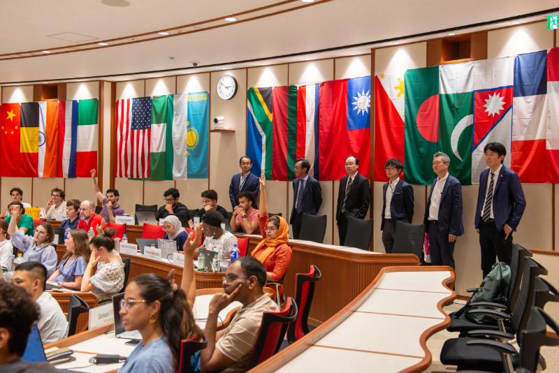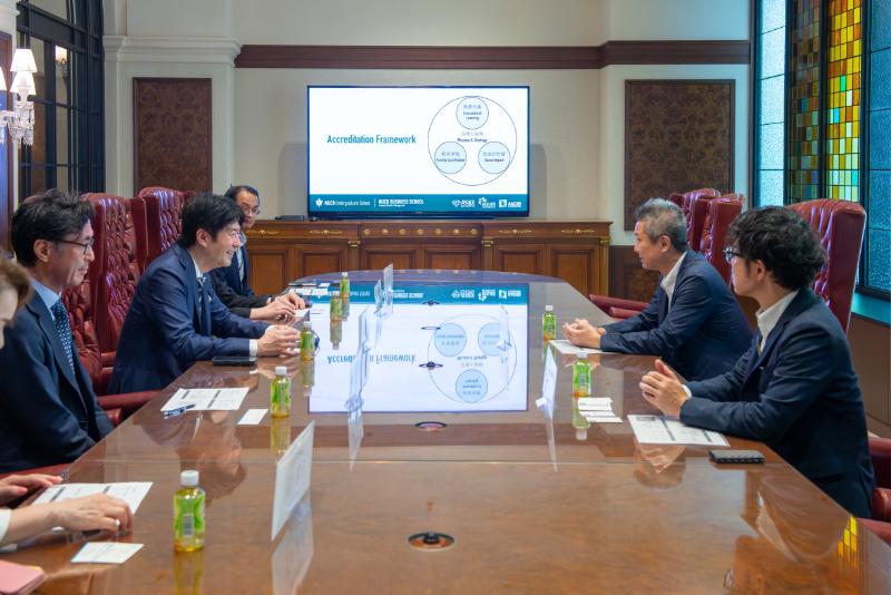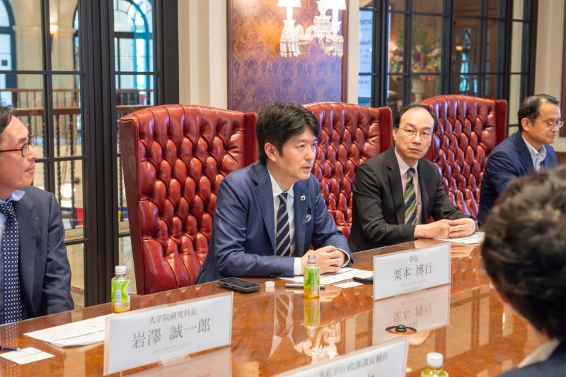 視察では、本学の授業の様子や教育施設をご覧いただいた後、栗本博行学長をはじめ、岩澤研究科長、矢本学長補佐、Louie Wong研究科長補佐、早川事務局長との間で、「教育の質」をテーマとした意見交換が行われました。