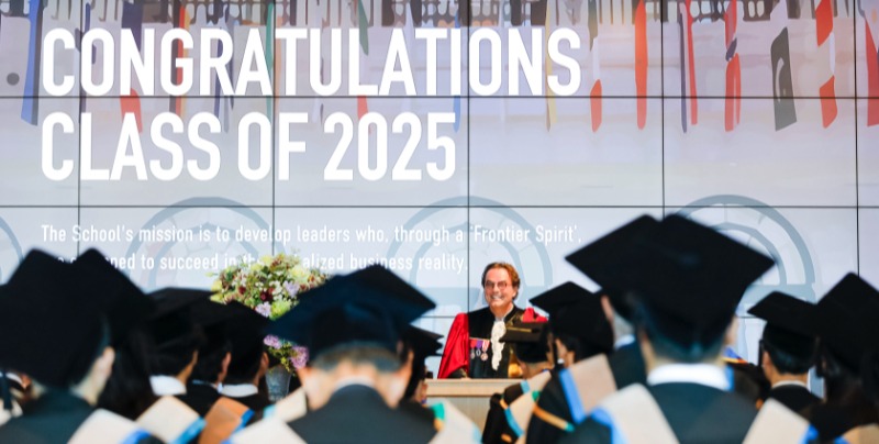 今年度の特別来賓として、EFMD Global 会長 Eric Cornuel(エリック・コーニュエル)教授をお招きしました。教授は、日本のことわざ「花より団子」を引用し、学びの真価は知識そのものではなく社会への応用にあると強調されました。さらに、多様性と協働の重要性、EQUIS認証に裏づけられたNUCBの教育の価値を述べ、変化の時代を生きる修了生に「責任あるリーダーシップ」を発揮し、自らの道を切り拓いてほしいと激励しました。