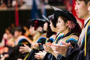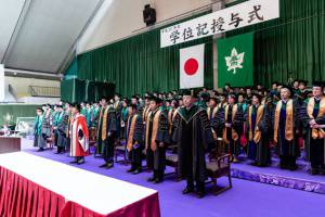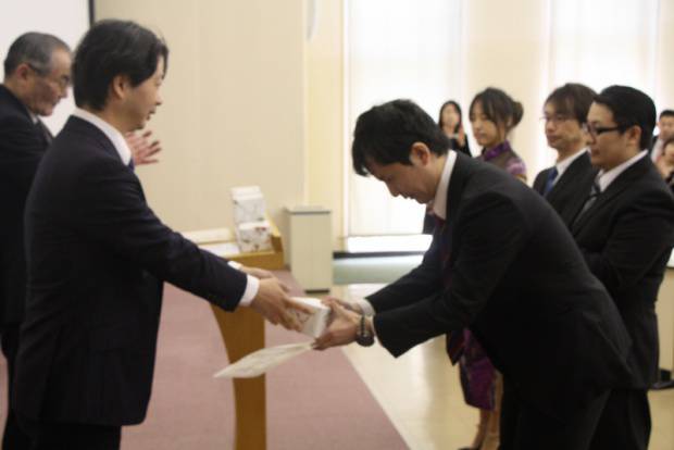 一人ひとりが順に壇上に上がり、教授から直接、学位記が手渡されます。皆さま、ズシリとくる学位記に2年間の努力を噛み締めている様子でした。