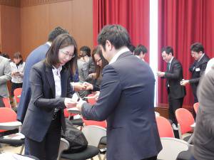志の高い全国の学友と親睦を深めていただくため、名刺交換会も企画いたしました。5分間で何名と名刺交換できるかという、ゲーム感覚の企画です。