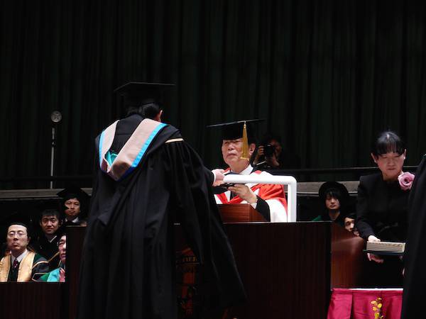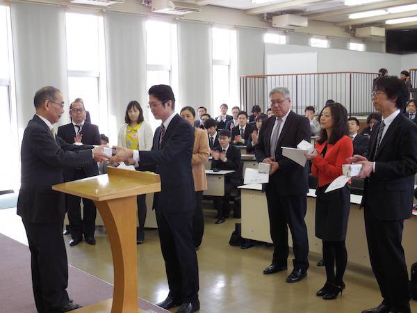 修了生は壇上でひとりひとり、栗本宏学長や川村稲造研究科長から直接学位記が授与されます。