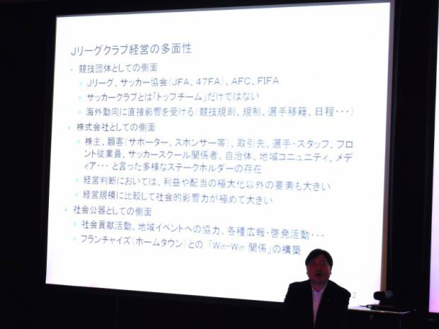 講座では、3年にわたるプロサッカークラブ「サンフレッチェ広島」の経営再建と運営経験に基づき、プロスポーツクラブの経営における経営・財務計画のあり方、ガバナンスやスポンサーやサポーターを含めたステークホルダー論、育成など将来投資の考え方、プロモーションのあり方、日本のプロスポーツの事業環境、将来に向けての課題などを論じていただきました。