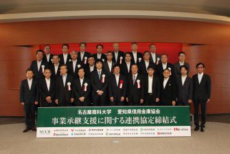 名古屋商科大学と愛知県信用金庫協会会員15金庫は、2015年7月10日に事業承継支援に関する連携協定を締結しました。本学教員と信用金庫職員らが研究員を務める「名古屋商科大学事業承継研究所」を設立し、親族内承継を目的とした事業承継人材育成に協同で取り組んでいます。親族内事業承継を支援することで、中小・小規模事業者の事業基盤強化を図り、技術・暖簾(のれん)を後世に伝えると共に、企業の長期的な成長や雇用創出、地域産業の活性化などを目指しています。